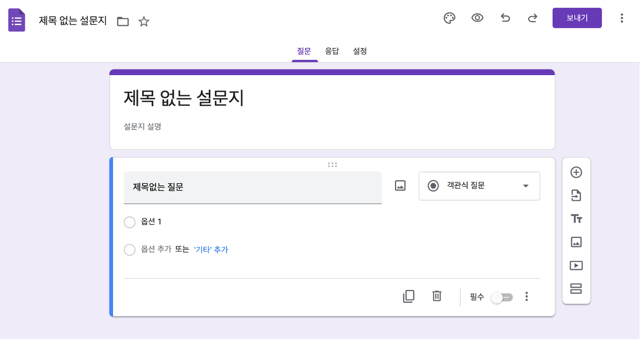 - 구글 설문지를 선택하면 아래와 같이 설문지 양식이 나타납니다.