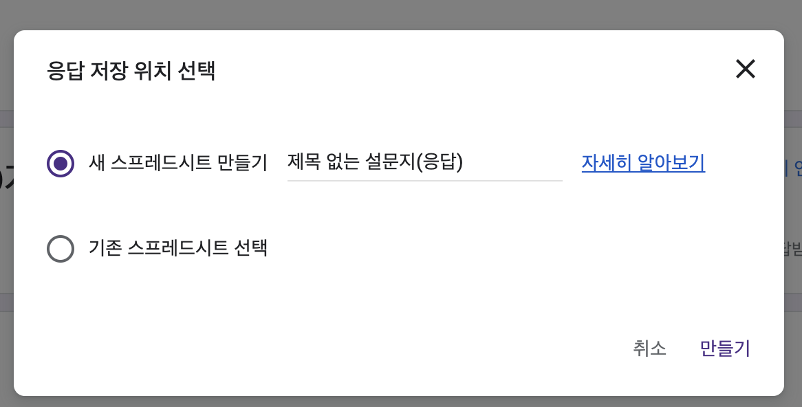 응답 저장 위치 선택하세요. (새 스프레드시트 만들기) 선택하기.
