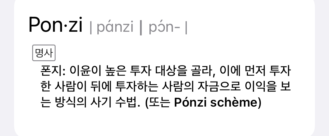 새로운 사람들의 돈으로 운영되는 피라미드는 지속가능하지 않아요. 점점 끌어당길 사람이 많아져야 (공급원) 하는데 인구는 한정적이잖아요. ^^